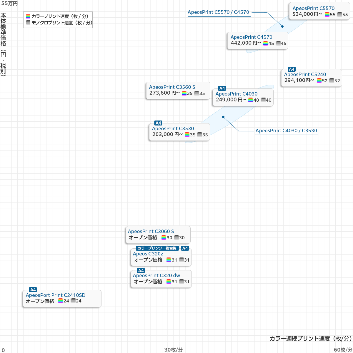 | ApeosPrint C5570 | 534,000円 | 55枚/分 | 55枚/分 | A3 | 1,200×2,400dpi | ![]() |