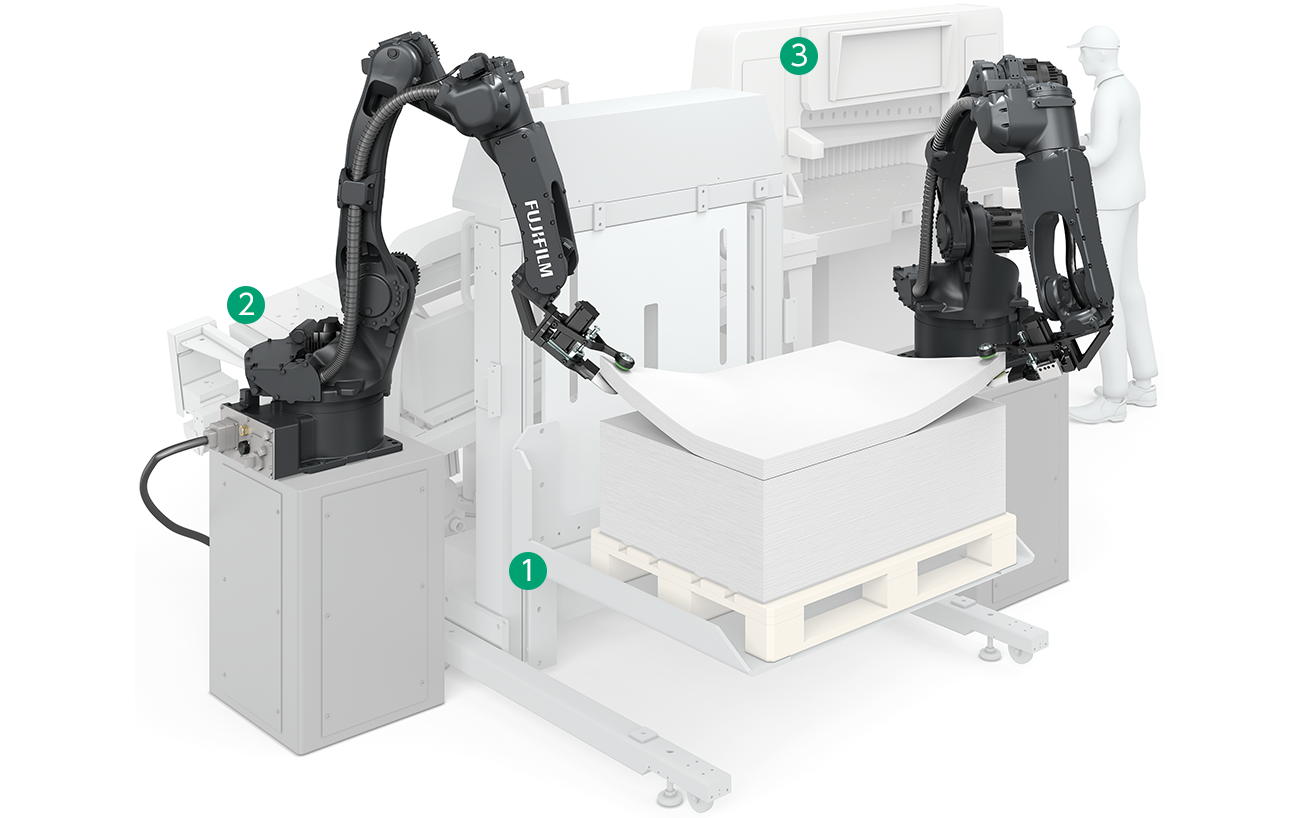 Revoria Kamisa PH12は、印刷後の大判用紙の束をつかみ、風入れをし、持ち上げて紙揃え機に運ぶ、断裁前の一連の作業負荷軽減と省人化を実現。印刷オペレーションに新たな革新をもたらします。