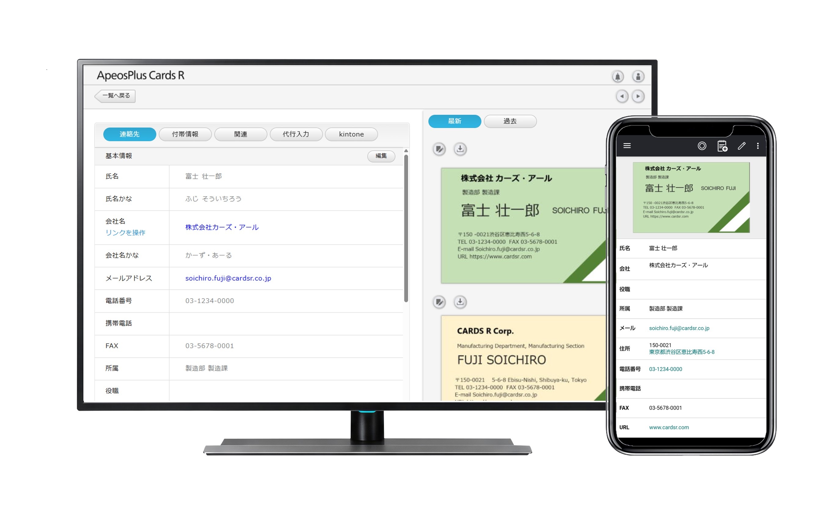 ApeosPlus Cards R は、名寄せ機能を搭載した名刺管理サービスです。同一人物と思われる名刺候補が存在すれば、自動でお知らせします。同一人物の名刺情報を統合(名寄せ)して管理できます。昇進や部署異動など、名刺情報が変更された際は、変更履歴も記録しておけます。