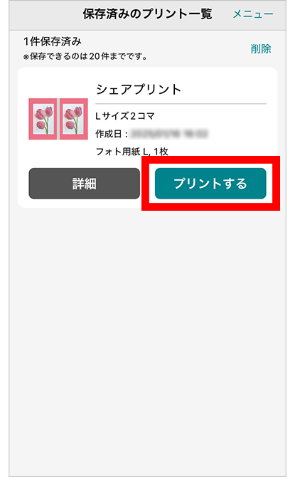 後でプリントする場合は、トップメニューの「保存済みのプリント一覧」をタップ。