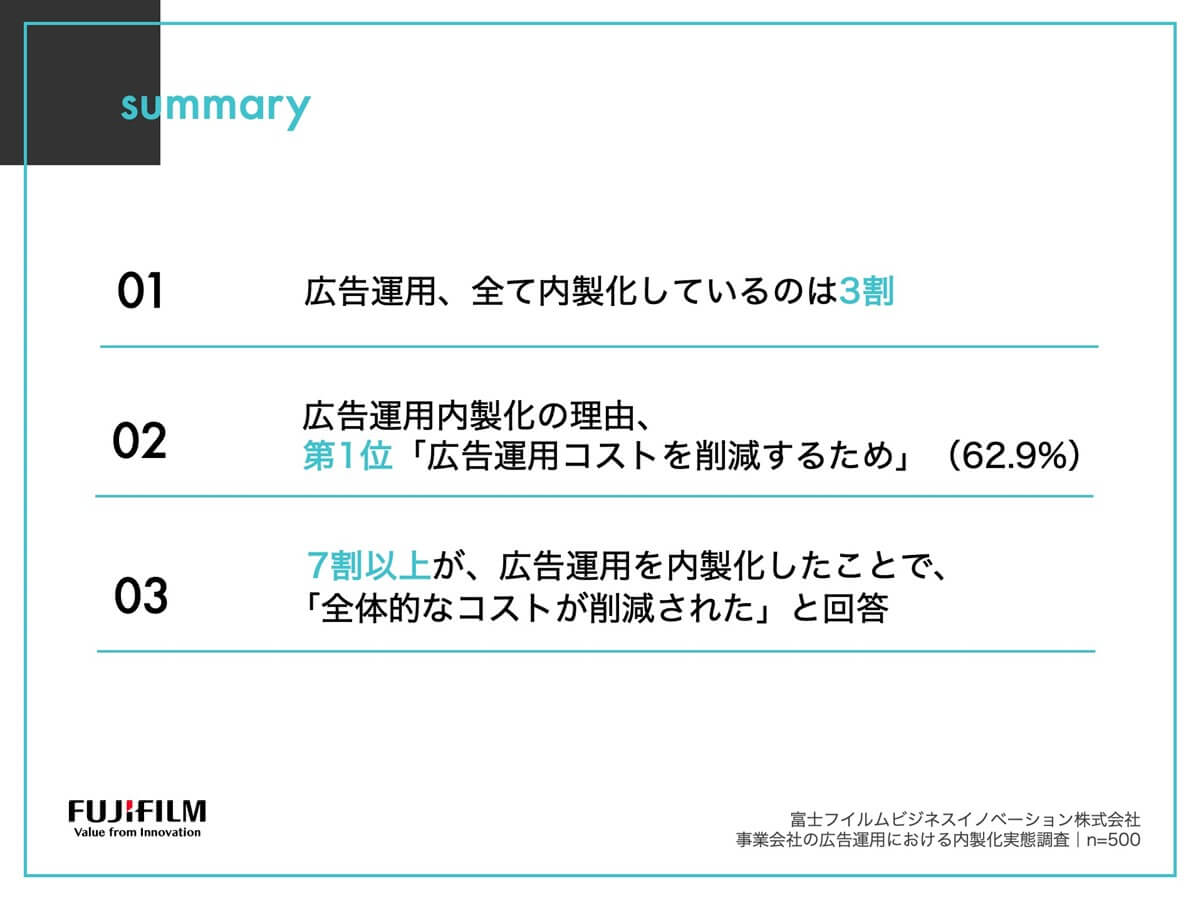 富士フイルムビジネスイノベーション株式会社(本社:東京都港区、代表取締役社長・CEO:浜 直樹)は、事業会社に勤めており、Web広告の運用に携わっているマーケティング担当者500名を対象に、事業会社の広告運用における内製化実態調査を実施しました。