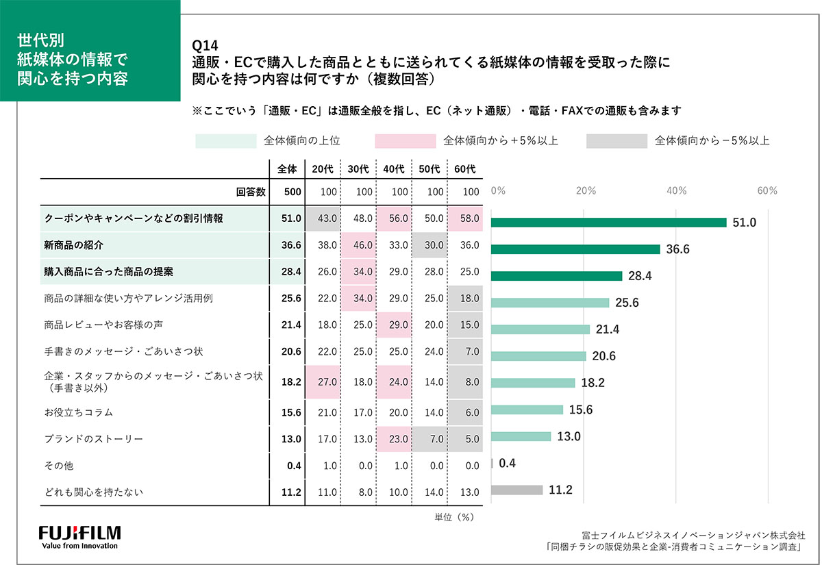 ここでは、通販・ECにおける消費者実態調査をもとに、世代ごとに紙媒体で関心を持たれやすい情報の特徴について解説します。