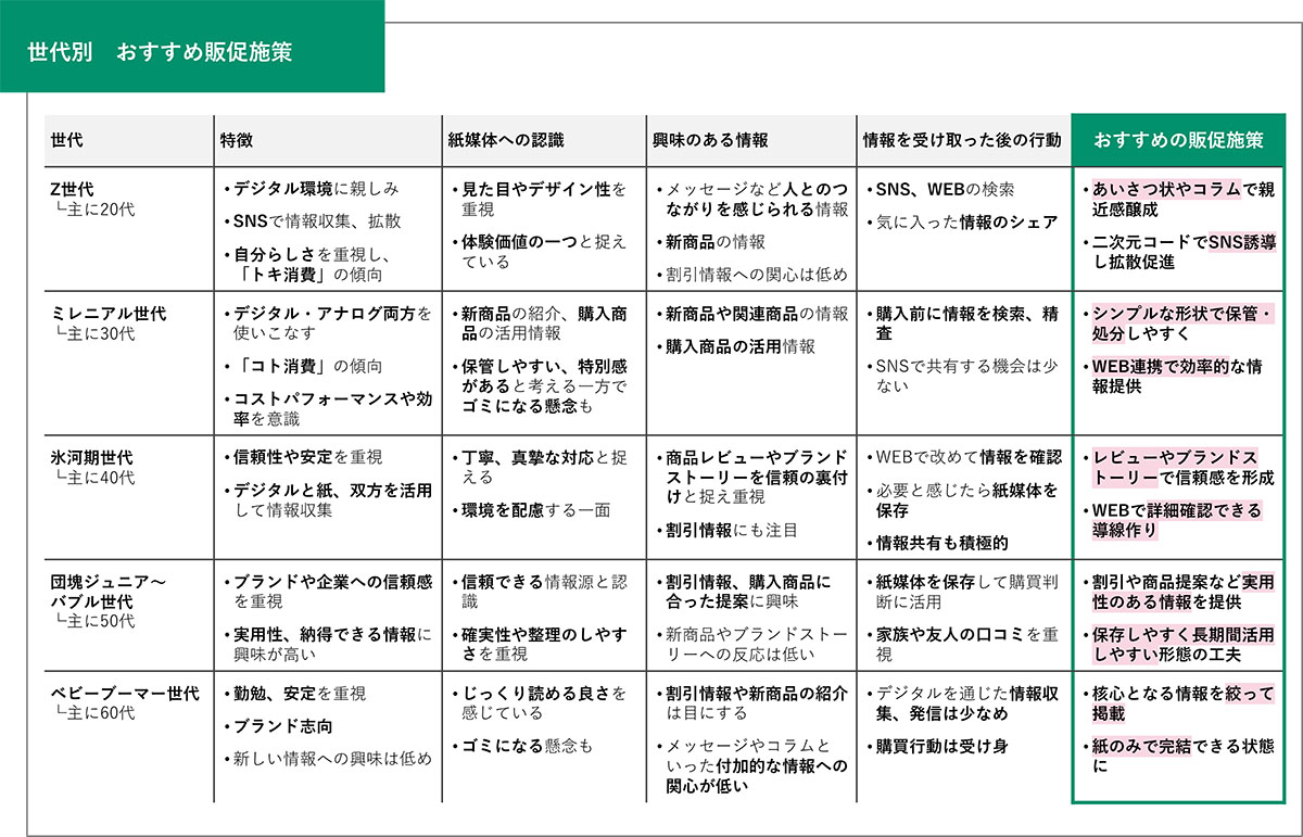 各世代にとって紙媒体は、信頼性・体験価値・実用性など多面的な価値を持っていることが見えてきました。最後に、これまで解説した特徴を踏まえた、世代別のおすすめ販促施策をご紹介します。