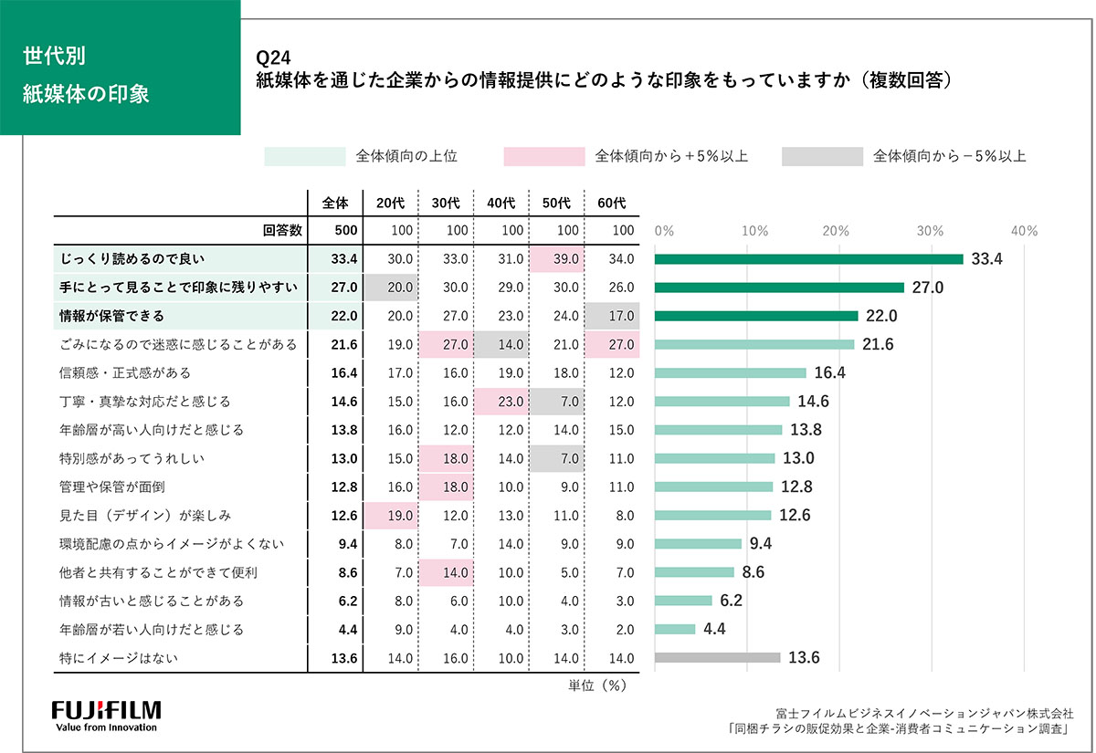 全世代を通した紙媒体の印象には「じっくり読める」、「印象に残りやすい」、「情報を保管できる」といった傾向がみられました。
