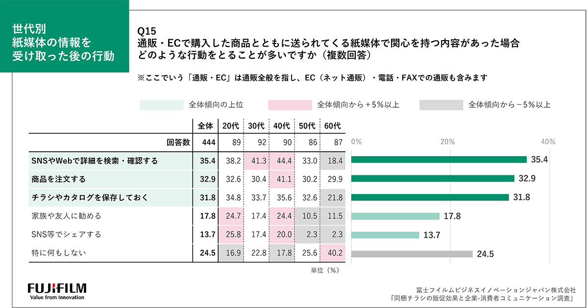 紙媒体を受け取った後に起こす行動は、世代によって異なります。ここからは、実態調査をもとに、世代別に行動の傾向を解説します。