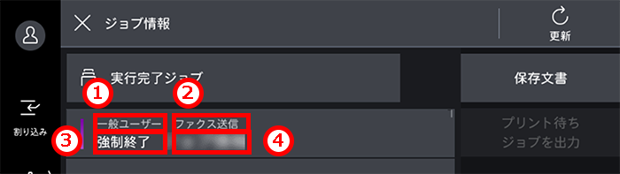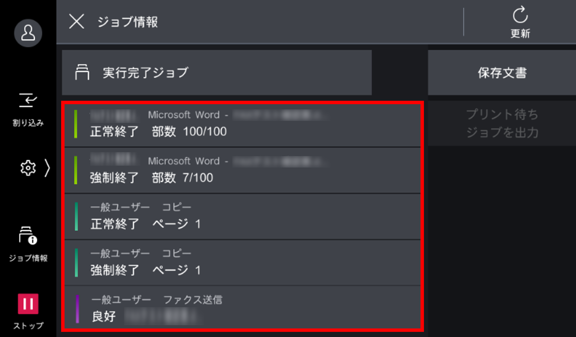 コピー、プリント、スキャン、ファクスなどのジョブの状態や履歴を機械本体で確認することで、エラーが表示されていたり、中止、完了しているかを確認できます。