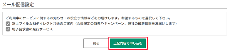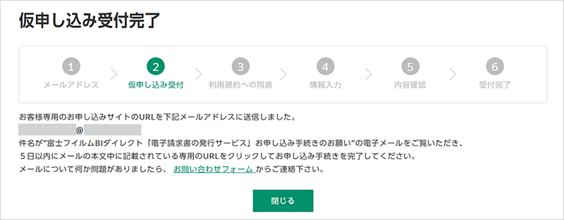 - ご入力いただいた[メールアドレス]宛に、件名が「富士フイルムBIダイレクト[電子請求書の発行サービス]お申し込み手続きのお願い」のE-mailが届きますので、本文中に記載されています専用のURLをクリックしてください。