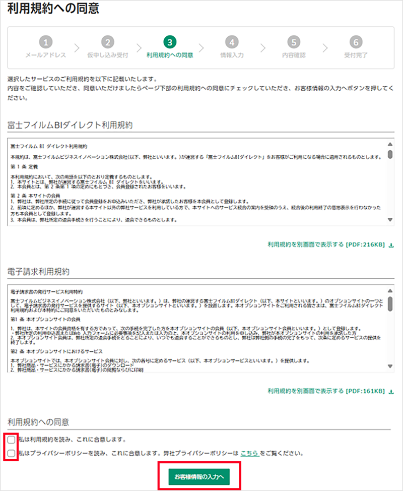 - 利用規約をご確認いただけましたら、[利用規約への同意]にチェックを入れ、[お客様情報の入力へ]をクリックしてください。