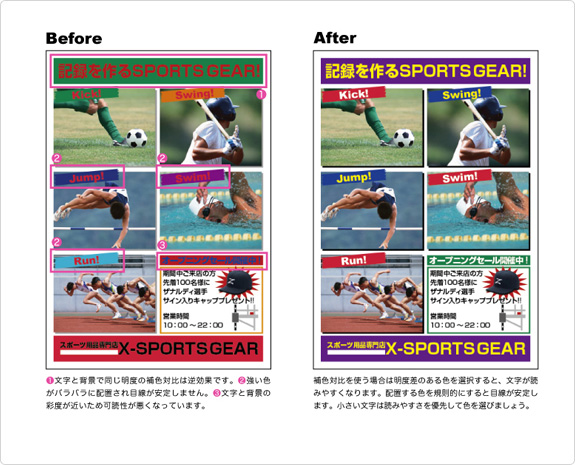彩度の高い色は同じ面積になるような組み合わせであれば、どちらも引き立ち強い印象を与えますが、文字と地色で使う場合は色の面積が一定にならないので、色の選び方は難しくなります。下の例にあるように大きなタイトルでも、文字を読みやすくするために、彩度の高いものどうしでも明度差のある色を選んだり、小さく使う部分では色味よりも文字の可読性を優先するなどの差をつけるといいでしょう。