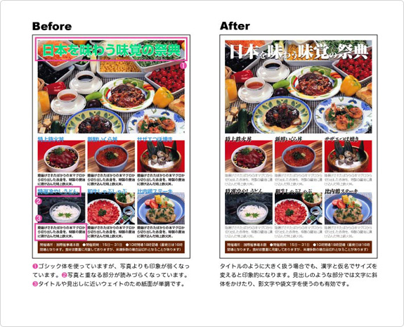 タイトルや見出しでは、ゴシック体や明朝体といった書体を使い分けたり、文字の太さの違いであるウェイトを使い分けることで、印象を強くすることができます。しかし、MSゴシックやMS明朝のように極細から極太までといった一揃いのファミリーが用意されていない書体を使った場合、ウェイトを使い分けられず、書体の印象が背景の写真に負けてしまうことがあります。