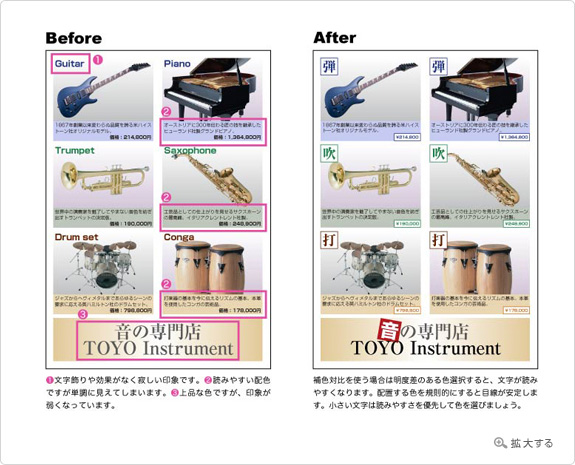 文字をアイコンとして見せるための最も簡単な方法は、囲みをつけて独立させることです。下の例では価格をそれぞれ個別に囲み、背景と同系色で彩度の高い色を使うことで印象的にしています。また、見出しのような文字列は、文字数に違いがありますので、必要な情報だけを抽出してアイコン化してみました。