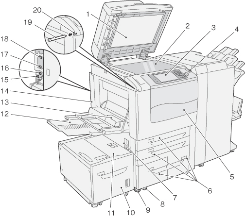 | 10 | 用紙トレイ6(大容量給紙トレイ1段) (オプション) | ここに用紙をセットします。 |