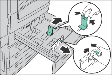 補足- 用紙サイズを変えるときや、用紙ガイドがずれているときは、2カ所の用紙ガイドレバーをつまみながら、セットする用紙に合わせます。