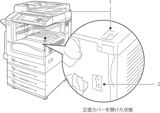 ]側を押すと、操作パネルの右側にある<主電源>ランプが消灯し、本体の電源が完全に切れます。ファクス機能をお使いの場合、主電源を切るとファクスのメモリーに蓄積されている内容が消去されることがあるので、ケーブルの接続や清掃などを行う場合を除き、通常は主電源スイッチを切らないでください。