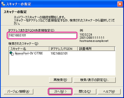 [スキャナーの指定]画面が表示されるので、スキャナーのIPアドレスを入力するか、または[検索されたスキャナー]から接続するスキャナーを選び、[次へ]をクリックします。
