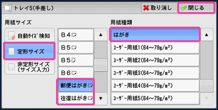 [定形サイズ]>[郵便はがき]または[往復はがき]>[はがき]を選び、[閉じる]を押します。