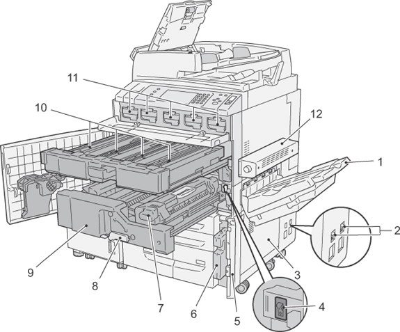 | 3 | 右側面下部カバー | 紙詰まりを処置するときに開けます。 フィニッシャーが装着されている場合は、フィニッシャーのフロントカバーを開けてから開けます。 |
