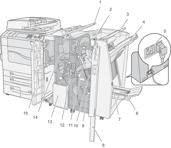 | 1 | 用紙トレイ8(インターポーザー) | 表紙や合紙用の用紙をセットします。ここにセットした用紙には、コピーやプリントできません。 |