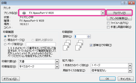 [プリンタ名]から本機を選び、[プロパティ]をクリックします。