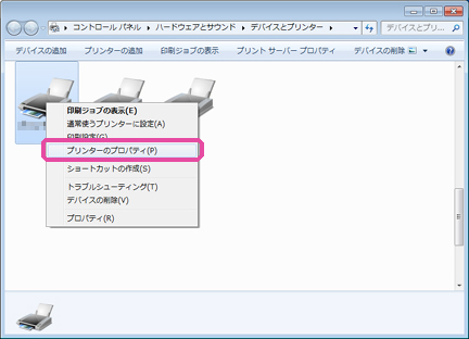 プリンターアイコンを右クリックし、[プリンターのプロパティ]を選びます。