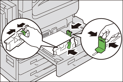 2. 2カ所の用紙ガイドレバーを、それぞれつまみながら移動し、用紙に軽く当てるように合わせます。