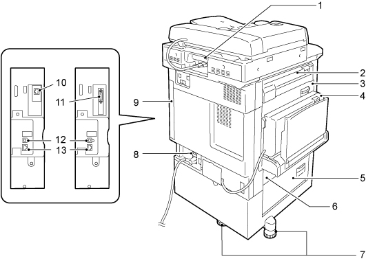 | 6 | 左側面下部カバー[B] | 紙詰まりを処置するときに開けます。用紙トレイ6が装着されている場合は、用紙トレイ6を左に移動してから開けます。 |
