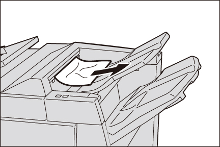 操作パネルにフィニッシャー排出トレイの排出口での紙詰まりを示すメッセージが表示されたら、次の手順に従って、詰まった用紙を取り除いてください。