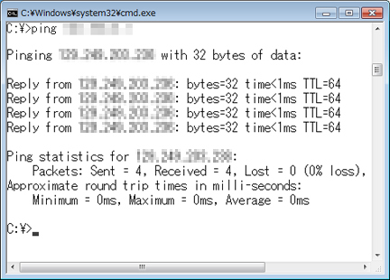 DOSプロンプトに「ping xxx.xxx.xxx.xxx」(xは機械のIPアドレス)と入力し、キーボードの<Enter>キーを押します。「ping」という文字とIPアドレスの間にスペースを必ず挿入します。