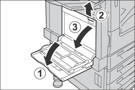 1. 手差しトレイを開いてから(1)、リリースレバーを上げながら(2)両面ユニットカバー[B]をゆっくりと開きます(3)。