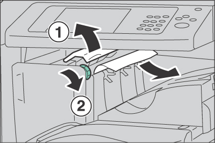 フィニッシャーの上面カバーを開け(1)、ノブを回して(2)、詰まっている用紙を取り除きます。