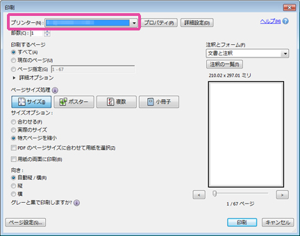 [プリンター]プルダウンメニューから本機を選びます(画像はAdobe Reader® X)。