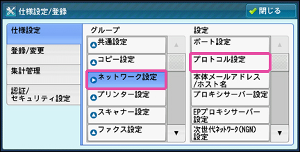 [仕様設定/登録]画面で、[仕様設定]>[ネットワーク設定]>[プロトコル設定]を押します。