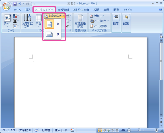 2. [ページレイアウト]タブを開き、[印刷の向き]>[縦]または[横]を選びます。