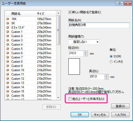 • ユーザー定義用紙に封筒を設定するときは、他のユーザーとの共有ができません。