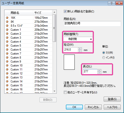 5. [新しい用紙名で登録]をチェックし、[用紙名]に封筒サイズ名称を入力します。