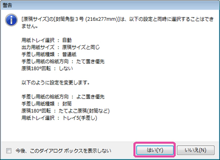 用紙セットの設定変更に関するメッセージダイアログが表示されたら、[はい]をクリックしてください。