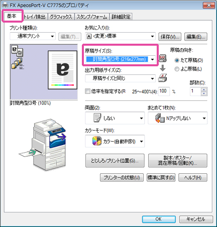 1. [基本]タブの[原稿サイズ]で、封筒サイズを登録する で登録した封筒サイズ名が選ばれていることを確認します。