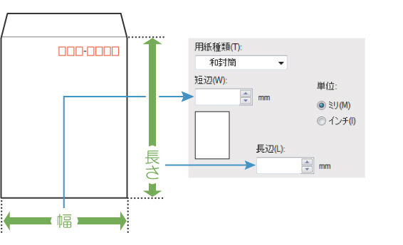 洋封筒の場合は[短辺]に長さを、[長辺]に幅を入力します。