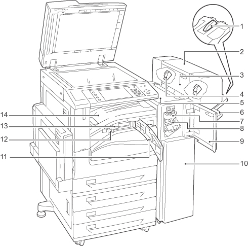 | 14 | センタートレイ(フィニッシャー接続部上面カバー) | フィニッシャートレイに用紙が排出できないとき、ここに排出されます。 紙詰まりの処置のときは、上に開けます。 |