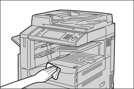 - 機械の清掃を行う場合は、電源スイッチを切り、本体正面カバー内にある主電源スイッチを切ってから、必ず電源プラグをコンセントから抜いてください。電源スイッチを切らずに機械の清掃を行うと、感電の原因となるおそれがあります。