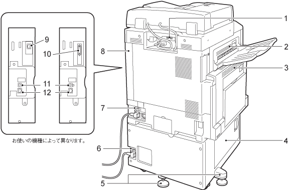 | 6 | リセットボタン (ApeosPort-V C7776/C6676のみ) | 漏電を検知すると、自動的に電源を遮断します。 |