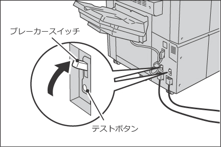 本体と用紙トレイ6(大容量給紙トレイA3ノビ1段)には、漏電ブレーカーが装備されています。漏電が起こったときに、電気回路を自動的に遮断して、漏電による事故や火災などを防ぎます。