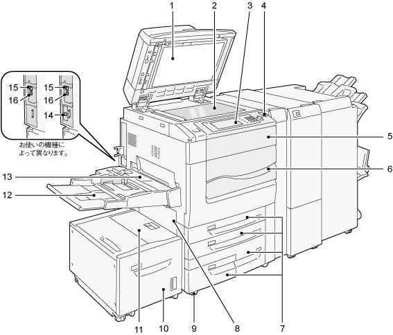 | 11 | 用紙トレイ6(大容量給紙トレイ1段)上面カバー | 紙詰まりを処置するときに、用紙トレイ6を左に移動してから開けます。 |