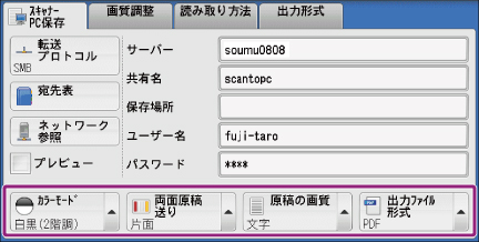 必要に応じて、[カラーモード]、[両面原稿送り]、[原稿の画質]、[出力ファイル形式]などの項目を設定します。