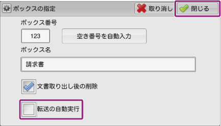 - 転送を再開しても、[転送の自動実行]のチェックを外したときにボックス内に蓄積された文書は転送されません。