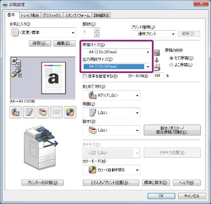 [原稿サイズ]と[出力用紙サイズ](ここでは[A4])を選びます。