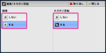 [読み取り方法]タブで[鏡像/ネガポジ反転]を押します。
