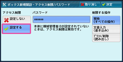 [アクセス制限]で[設定する]を選び、数字ボタンを使用して[パスワード]に親展ボックスの新しいパスワードを入力します。