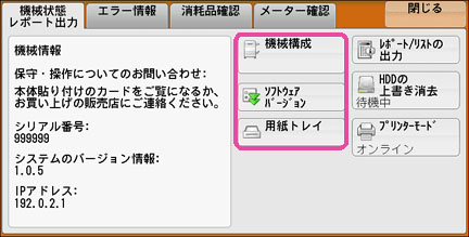 本体の機械構成/ソフトウェアバージョン/用紙トレイの状態などを確認したい