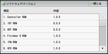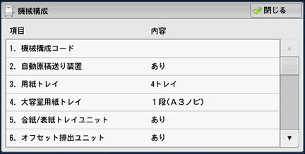 本体の機械構成(装着されているオプション)、各ソフトウェアのバージョン、および用紙トレイの用紙残量や用紙種類などを確認できます。